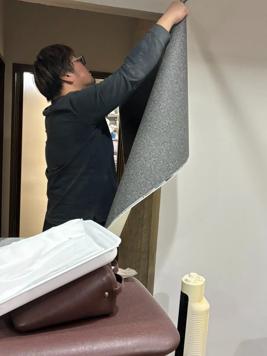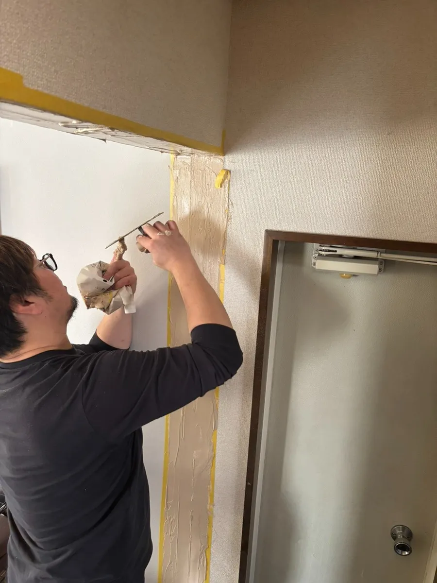 壁に取り付けられたサッシを外しパテーを塗り平らにし壁紙も一部変えました!自分も少しやってみたのですがパテーを平らに塗るのがとても難しかったです、、、やっぱ職人の方はすごい!!